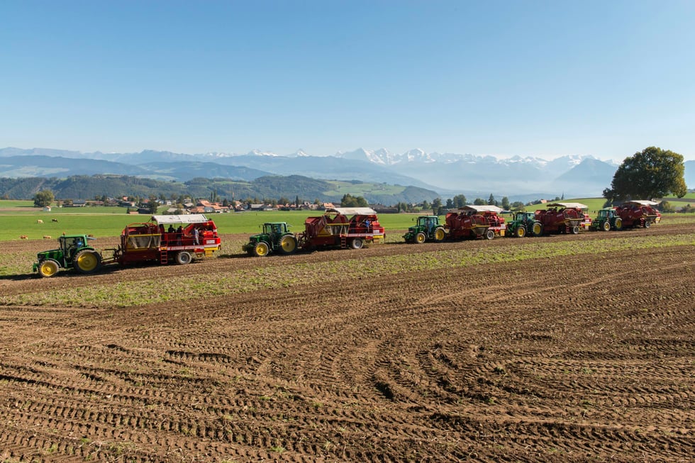 Um an die verschiedenen Schauplätze zu gelangen, durfte ich in einer grossen Erntekiste/box Platz nehmen, wurde mittels Traktor und Hebebühne in die Höhe gehievt und auf dem Feld herumgefahren, um aus verschiedenen Positionen Fotos zu erstellen. Während der Fahrt schüttelte es zeitweise ziemlich stark, so dass ich mich (und die beiden Kameras) richtig gut festhalten musste. Nicht nur die Arbeit mit 5 Grimme-Vollernter-Maschinen war beeindruckend (dazu brauchte es doch einiges an Personal), sondern auch die Landschaft auf dem Längenberg, die Sicht auf die Berner Alpen und das ganze Drumherum. Weitere Fotos sehen Sie hier (bitte klicken) oder auf der Website des Lohnunternehmens Guggisberg (bitte dazu hier klicken).
